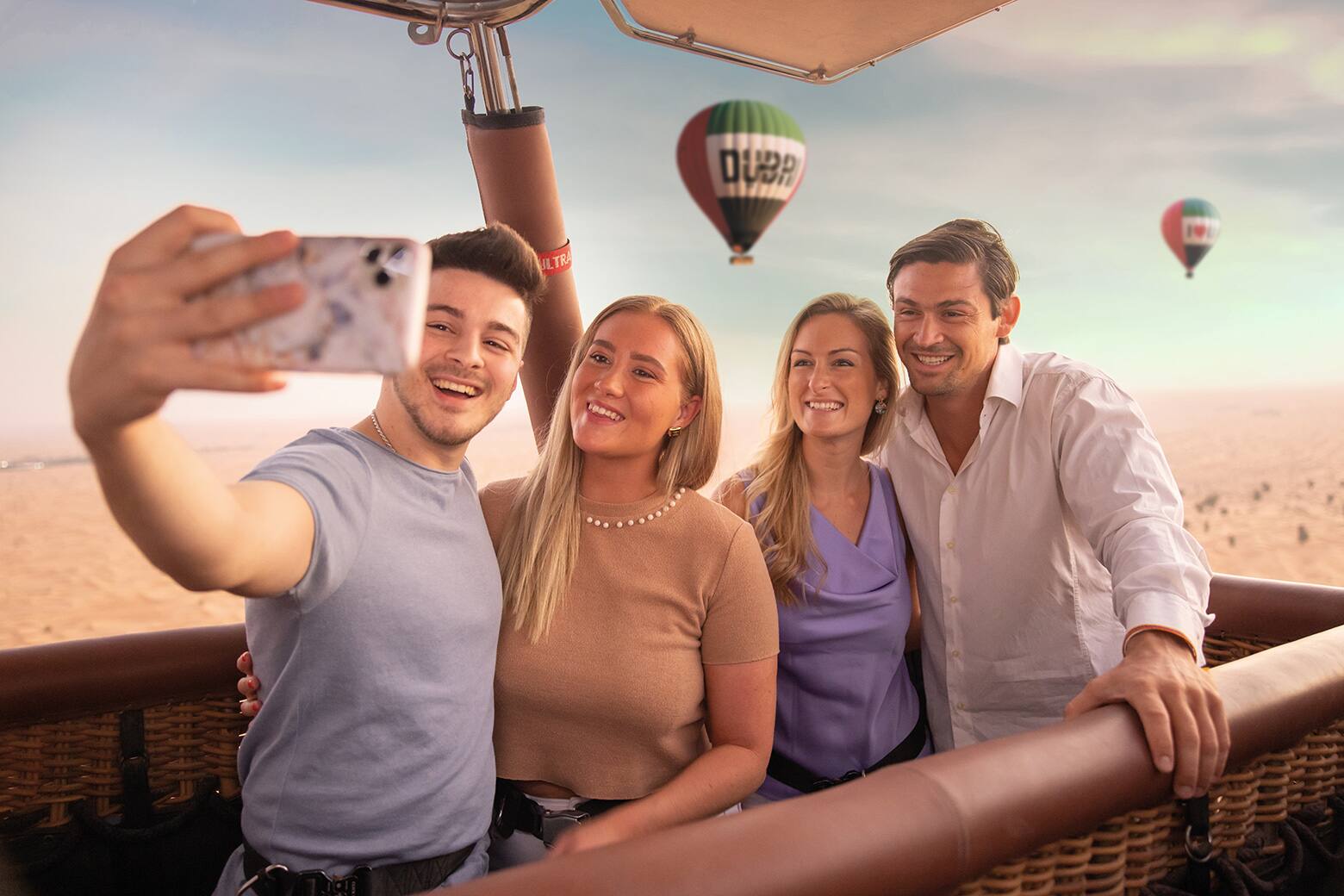 Schweben Sie bei einem Heißluftballon-Abenteuer hoch über der wunderschönen Wüstenlandschaft Dubais.
